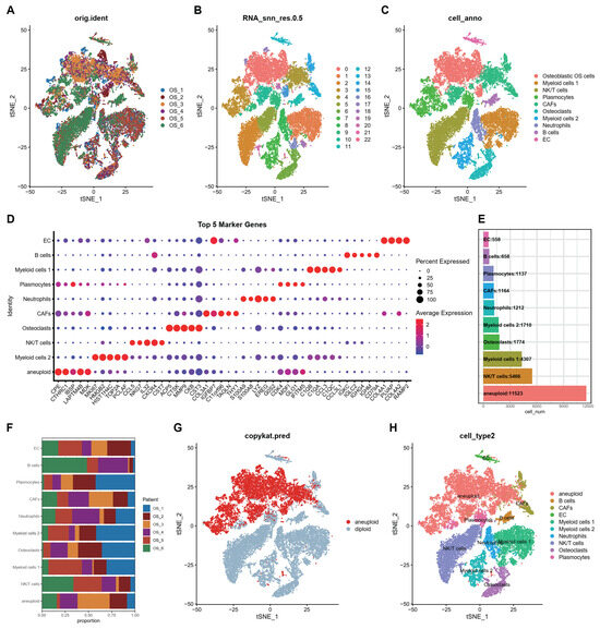 scRNA-Seq analysis for GSE162454. (A) The plot generated using T-distributed stochastic neighbor embedding (tSNE) technique is colored by patients. (B) The t-SNE plot is colored based on the 23 different cell types. (C) The tSNE plot was colored to display 10 distinct cell types. (D) The heatmap illustrates the top five markers of the ten clusters. (E,F) The boxplot displays the cell numbers and proportion of the ten cell clusters. (G,H) The t-SNE plot is colored based on the aneuploid and diploid groups (G), as well as the 10 distinct cell types (H), utilizing the copykat R package for CNV analysis.