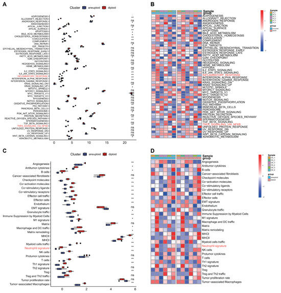 HALLMARK_genesets and functional gene expression signatures (Fges) analysis for GSE162454 between aneuploid and diploid groups. (A,B) Comparison of the disparities in the 50 HALLMARK_genesets between aneuploid and diploid groups in the GSE162454 sets. (C,D) Comparison of the variations in the Fges between aneuploid and diploid groups in the GSE162454 datasets, with red indicating case group and dark blue representing control groups. ns: p > 0.05; * p < 0.05, ** p < 0.01.