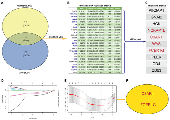 The hub genes detection form NRGs and DEGs from Target-OS. (A) The Venn diagram illustrates the presence of 24 differentially expressed genes (DEGs) resulting from the overlap between 538 neutrophil-related genes (NRGs) and 161 up-regulated DEG mRNAs from Target-OS. (B) The most significant candidate genes were identified through the implementation of univariate Cox regression analyses. (C) Prognostic signature genes were selected based on their association with survival outcomes, as demonstrated by Kaplan–Meier (KM) survival curves in Target-OS. (D,E) The LASSO algorithm was employed to select hub genes. (F) The LASSO algorithm identified two genes, namely C3AR1 and FCER1G, as significant.