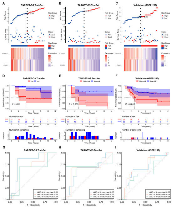 In order to develop a prognostic risk model, the TARGET-OS cohort was divided into training sets (n = 50) and testing sets (n = 33) at a ratio of 6:4, while the GEO cohort (n = 53) was used for validation purposes after removing 5 cases with unknown survival time (n = 2) and zero survival time (n = 3). Subsequently, the training set was utilized to construct the final prognostic model, represented by the equation Risk Score = −0.0812 × C3AR1 − 0.012 × FCER1G.