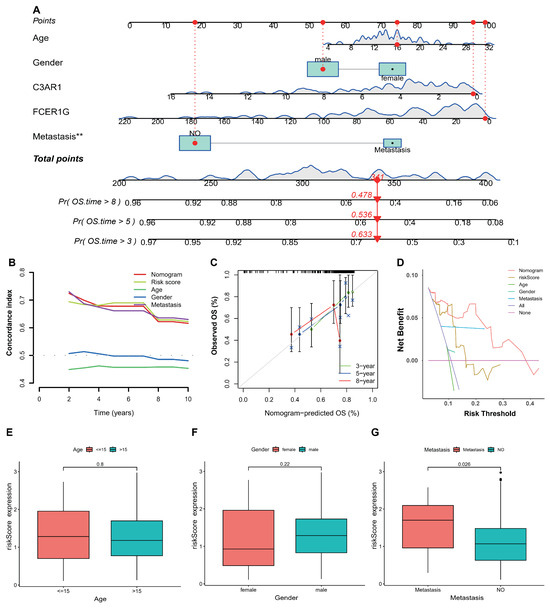 The nomogram served as a robust instrument for the comprehensive assessment of patient prognosis by incorporating clinical variables. In the present investigation, the construction of the nomogram was carried out using the TARGET-OS databases, with the aim of predicting the survival rates at 3, 5, and 8 years for individuals diagnosed with osteosarcoma. The inclusion of gender, age, metastasis status, and two key genes facilitated the development of the nomogram for osteosarcoma. The graphical representation in Figure 5A depicts the nomograms for predicting the survival outcomes of patients with TARGET-OS at 3, 5, and 8 years. The results of the study demonstrated that the nomogram, riskscore, and metastasis exhibited a high concordance index with time, as depicted in Figure 5B. Additionally, the calibration plots indicated that the performance of the nomogram was comparable to that of the good model, as shown in Figure 5C. Furthermore, the decision curve analysis (DCA) revealed that the nomogram possessed significant potential for clinical utility, as depicted in Figure 5D. Lastly, the study investigated the correlations between clinical features and the riskscore, particularly in relation to patients’ metastasis status in TARGET-OS, as illustrated in Figure 5E–G.