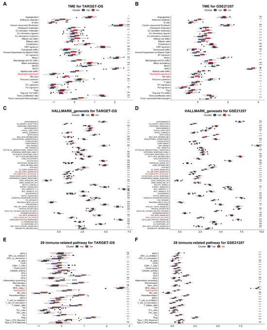 The hub genes remodel TME in OS. (A,B) Comparison of the differences in the Fges of TME between high and low risk groups in TARGET-OS and GSE21257 cohorts, respectively. (C,D) Comparison of the differences in the 50 HALLMARK_genesets between high and low risk groups in TARGET-OS and GSE21257 cohorts, respectively. (E,F) Comparison of the differences in the 29 immune related pathways between high and low risk groups in TARGET-OS and GSE21257 cohorts, respectively. Red indicates low risk groups, while dark blue indicates high risk groups. ns: p > 0.05; * p < 0.05, ** p < 0.01, *** p < 0.001.