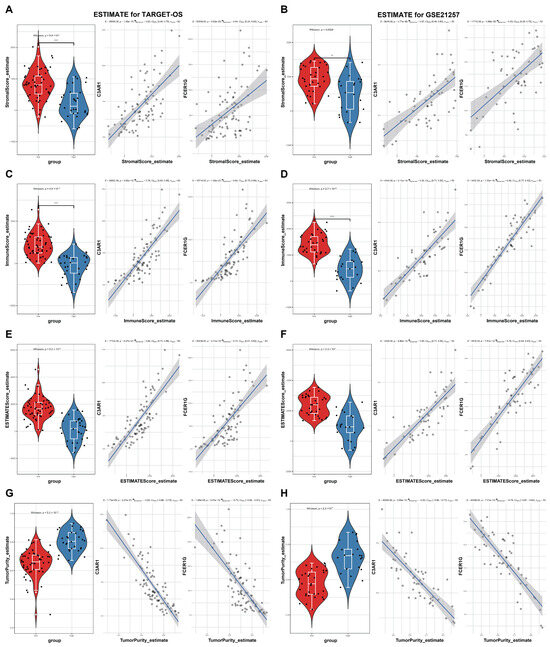 ESTIMATE evaluation based on the two hub genes. (A–H) In both the TARGET-OS and GSE21257 cohorts, a comparison was made between high and low samples regarding the stromal scores, immune scores, ESTIMATE scores, and tumor purity. Additionally, it was observed that C3AR1 or FCER1G exhibited a significant positive correlation with stromal scores, ESTIMATE scores, and immune scores, while displaying a strong negative correlation with tumor purity in both cohorts. ** p < 0.01, ****: p < 0.0001.