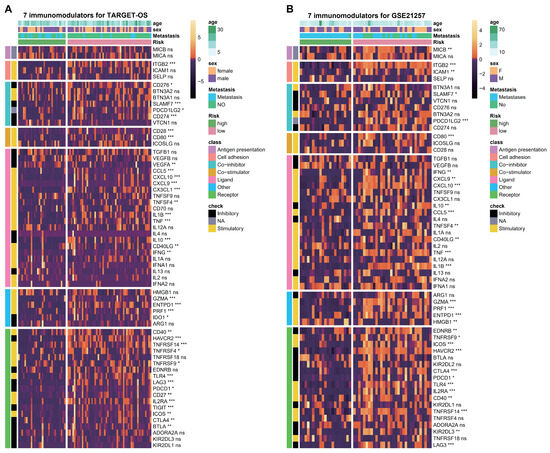 Evaluation of immunomodulators based on the two hub genes. (A,B) Heatmap displaying enrichment of immunomodulators through 7 algorithms between high- and low groups according to C3AR1 and FCER1G levels in the TARGET-OS (A) and GSE21257 cohorts (B). ns: p > 0.05; * p < 0.05, ** p < 0.01, *** p < 0.001.