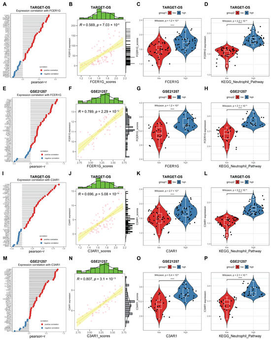 The activation of the KEGG neutrophil signaling pathway (NSP) by C3AR1 and FCER1G in OS was investigated. Subsequently, a correlation analysis was conducted between FCER1G/C3AR1 and the KEGG NSP using two datasets. Notably, our analysis revealed a significant positive correlation between FCER1G and the majority of genes within this pathway (Figure 9A,E). Moreover, the ssGSEA algorithm was utilized to assign scores to the KEGG NSP in the two datasets. Based on the obtained scores, a distinct positive correlation was observed between FCER1G and the KEGG NSP (Figure 9B,F). Lastly, the current study provides evidence of the capacity to differentiate pathway scores among subgroups characterized by high and low FCER1G expression (Figure 9C,G), as well as to discern FCER1G expression levels between subgroups with high and low pathway scores (Figure 9D,H). Similarly, a comparable positive association between C3AR1 and the KEGG NSP was observed in OS (Figure 9I–P). These findings suggest that elevated FCER1G/C3AR1 expression is implicated in the progression of AP through involvement in the KEGG NSP.
