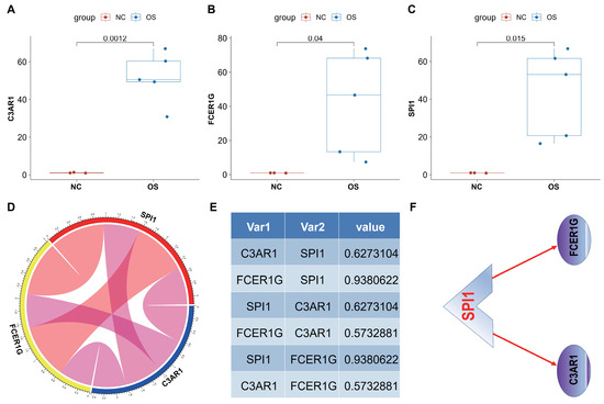In order to further substantiate the expression of the C3AR1, FCER1G, and SPI1 genes, we conducted an evaluation of these genes in three K7M2-induced Balb/c mice. Initially, we conducted a comparative analysis of gene expression levels in the left thigh muscle of healthy control mice and OS tissues of K7M2-induced Balb/c mice using RT-qPCR. Our findings from RT-qPCR analysis of OS tissue samples revealed a significant upregulation of the three genes in OS tissues compared to normal tissues (Figure 11A–C). Additionally, the correlation circle pipes (Figure 11D) and cor value (Figure 11E) demonstrated positive correlations among the three genes in OS tissues. Consequently, it can be inferred that SPI1 positively regulates the two hub genes, suggesting a potential mechanism (Figure 11F).