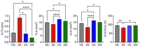 For cortical bone microstructure, the AA group exhibited a significantly higher (p < 0.05) Ct.Th [0.93 (0.03)] compared to the other groups: NC [0.36 (0.01)], CA [0.31 (0.04)], and AW [0.16 (0.05)]. Additionally, the AA group showed significantly (p < 0.0001) lower total cross-sectional area (Tt.Ar) [13.53 (0.55)] and cortical area (Ct.Ar) [11.13 (0.29)] (p < 0.0001) compared to the CA group, with Tt.Ar and Ct.Ar values of [17.44 (0.65)] and [16.37 (0.54)], respectively. Furthermore, the cortical area fraction (Ct.Ar/Tt.Ar) was significantly lower in the AA group [82.93 (4.12)] (p < 0.01) compared to the NC, CA, and AW groups, with [94.92 (0.94)], [93.94 (0.58)], and [93.78 (0.56)], respectively, as shown in Figure 1.