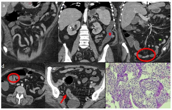 A 47-year-old woman with a diagnosis of acute lymphoblastic leukemia Ph+ (ALL) underwent a match-unrelated transplant, receiving a conditioning regimen based on TBI (total body irradiation) and fludarabine. A GVHD prophylaxis was made using cyclosporine (CsA) and methotrexate (MTX) (Table 1). Nine months after the transplant, she exhibited diarrhea, hematochezia, and persistent abdominal pain. She had a history of weight loss and malabsorption. She had no previous history of GVHD. Blood culture, urine culture, blood Epstein–Barr virus (EBV) and cytomegalovirus (CMV) in PCR-RT, and a nasopharyngeal aspiration respiratory viral study were all negative. A colonoscopy was performed, and histology on the biopsy sample was suggestive of chronic colitis in the chronic phase of GVHD (Figure 10). Fragments of the colon mucosa showed an architectural distortion of the glandular component (associated with a slight depletion of the mucosal portion), edema, and a mild chronic inflammatory infiltrate in the lamina propria with focal images of cryptitis up to occasional cryptic microabscesses (Figure 10). However, after a few days, her clinical symptoms worsened. A CECT was requested to rule out an abdominal occlusion. The CECT showed a serpiginous appearance of the small bowel loops, with multisegmental stenotic parietal thickness at the level of the jejunal–ileal loops (Figure 10). It also showed diffuse and marked distension of the rest of the intestine with signs of SBO. Other segmental and focal parietal thicknesses were also noted at the terminal ileus and the appendix, and a diffuse parietal thickness of the colon with stratified enhancement was also present (Figure 10). Stenosis in chronic GI-GVHD was suspected. A mild comb sign with mild ascites was also present. In this specific case of cGVHD, the CT signs of chronic ileal inflammation were very similar to those observed in Crohn’s disease.