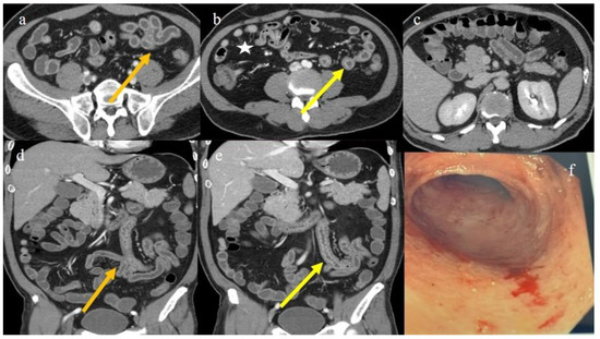 A 51-year-old man with a previous history of Hodgkin lymphoma (HL) underwent HSCT from a haploidentical donor, receiving a conditioning regimen based on thiotepa, busulfan, and fludarabine. A GVHD prophylaxis was made using PT-Cy, cyclosporine, and mycophenolate mofetil. On day 20 after HSCT, he presented with profuse diarrhea, and a clinical diagnosis of GVHD with GI intestinal involvement was made (Table 1). The CECT was requested for acute abdominal pain and showed a ribbon-like appearance (Figure 2a,d) of the intestinal loops with diffuse parietal thickness, homogeneous enhancement of the small bowel loops, and stratified enhancement of some jejunal loops (Figure 2b,e). A mild colic and small bowel fluid distension (Figure 2c) were present. Diffuse mesenteric congestion with a comb sign was also present with poor reactive lymph nodes (Figure 2b,e). A mild thickness of the stomach walls at the level of the antropyloric region was described on CECT. The extraintestinal findings included a mild distension of the biliary tree and a mild gallbladder thickness.