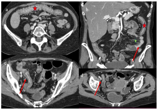 The CECT findings of the GI aGVHD in case #3, 92 days after HSCT. The diffuse colic homogeneous thickness with stratified enhancement (red star) is shown on the axial plane in image (a) and on the coronal plane in image (b). Image (b) also shows a segmental small bowel thickness with homogeneous enhancement (red arrow) with diffuse comb sign (green star). Image (c) shows the stratified enhancement of the terminal ileus (red arrow) with mild fluid distension at the level of the rectus and sigma. Image (d) shows the appendix thickness (red arrow).