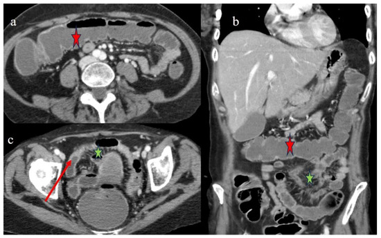 The CECT findings of case #3 129 days after HSCT. Images (a,b) show the colic fluid distension (red star) with mucosal enhancement on the axial and coronal plane, respectively. Image “c” shows the persistence of terminal ileal thickness with mucosal enhancement (red arrow). The diffuse comb sign is shown in images (b,c) (green star).