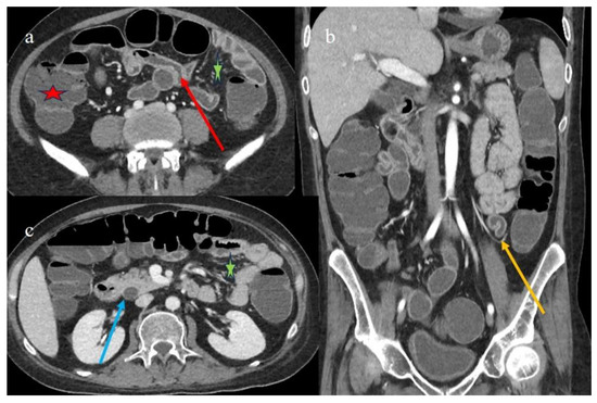 Image (a) represents a segmental thickness with mucosal enhancement at the level of the sigma (red arrow) on day 120 after the HSCT of case #4. Images (b,c) show that the serpiginous appearance (orange arrow) and the parietal thickness with mucosal enhancement (red arrow) were more evident than in the previous control. Image (b) also shows the stratified enhancement of the transverse colon (red star). Image (d) shows the duodenal thickness (red arrow), and image (e) shows the persistence dilatation of the main biliary duct (blue arrow).