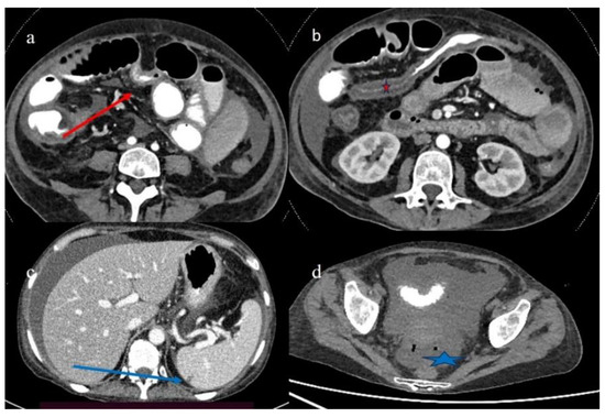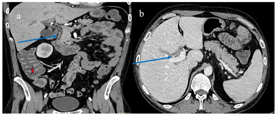 The CECT control for case #4 after 8 months showed a mild fluid colic distension (image (a), red star) with the persistence of dilatation of the main biliary duct (image (a,b) blue arrow).