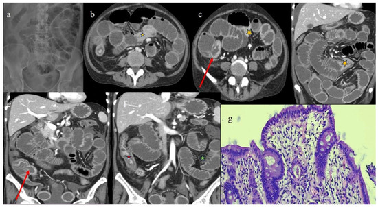 The CECT features seen in the emergency department 9 months after HSCT in case #5. Image (a) represents the CT scout view showing the serpiginous appearance of some small bowel loops. Images (b,c,d) show the long segmental inflammatory jejuna stenosis (orange star) with sign of SBO. A segmental and focal thickness of the terminal ileus and the appendix is also reported in images (b) (red arrow) and (e). Image (f) shows a diffuse stratified enhancement of the colon (red star) with mild comb sign (green star). Image (g) shows colic mucosa with architectural distortion of the glandular component, with associated mucin depletion and chronic inflammation of the lamina propria. Hematoxylin and eosin staining, 100×.