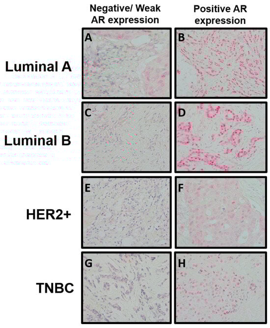 Nuclear AR expression (pink/red) in breast tumor subtypes as defined by ER, PR, and HER2 (magnification = 200×). Panels (A,C,E,G) represent negative or weak AR expression (H-score ≤ 10) in Luminal A, Luminal B, HER2+, and TNBC subtypes, respectively. In contrast, panels (B,D,F,H) represent strong nuclear expression of AR (H-score > 10) for Luminal A, Luminal B, HER2+ and TNBC subtypes, respectively.