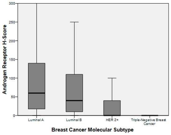 Of the luminal A, luminal B, HER2-overexpressing, and TNBC subtypes, 20.2%, 22.2%, 55.6%, and 75.8% were AR-negative (p < 0.001). Images of the AR expression in each breast cancer subtype are depicted in Figure 1. AR expression and H-scores were also plotted and were found to be the highest for luminal A tumors (mean = 92.23 ± 87.11), followed by luminal B tumors (mean = 69.15 ± 79.24) and HER2-overexpressing tumors (mean = 32.06 ± 61.10). TNBC had the lowest AR H-score with a mean of 21.89 (±55.45) (ANOVA p < 0.001) (Figure 2).