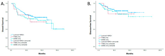 Survival analysis of luminal tumors, TNBC, and QNBC. No differences in (A) verall survival and (B) disease-free survival were noted between luminal tumors, TNBC, and QNBC.