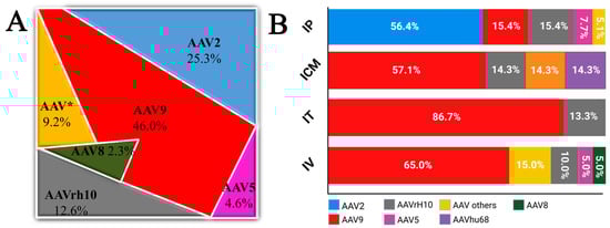 The presence of antibodies against AAV in humans has been reported to be around 40–70% []. AAV can infect both dividing and nondividing cells []. These small viruses lack an envelope and have a size of about 26 nm, with a single-stranded genetic material consisting of 4.7 kb [,,]. The AAV genome comprises sections including the promoter, polyA, replication-responsive genes (Rep), capsid structural genes (Cap), and assembly activation protein (AAP) genes [,,]. At both ends of the genome, there are terminal repeats consisting of 125 nucleotides, known as inverse terminal repeats (ITRs) [,].