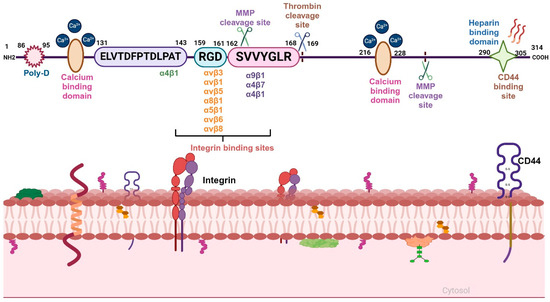 Structural domains of full-length OPN and its receptors. N-terminus of OPN consists of the poly-D region, calcium-binding domain and ELVTDFPTDLPAT sequence motif, which interacts with α4β1 integrin. The central region consists of the RGD domain, which binds with other integrins such as αvβ3, αvβ1, αvβ5, αvβ6, αvβ8, α5β1 and α8β1; the SVVYGLR sequence binds to α9β1, α4β1 and α4β7 integrins. The C-terminal region includes another calcium-binding domain, MMP-cleavage site and heparin-binding domain, which facilitate the interaction of OPN with CD44.
