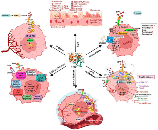 OPN has been shown to stimulate the progression of cancer by activating specific signaling pathways. These components collectively create an intracellular signaling traffic network that controls the expression of various oncogenic molecules that are essential for initiating tumorigenesis, regulating EMT, stemness, angiogenesis, metastasis and drug resistance. The OPN-regulated various oncogenic functions are depicted in Figure 4.