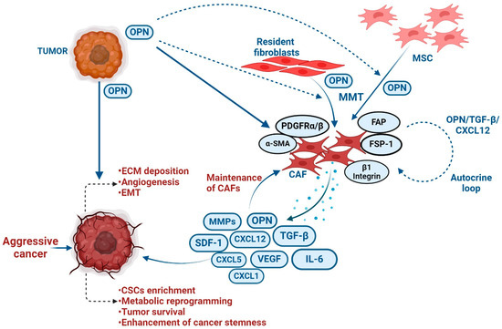 Differentiation of resident fibroblasts and MSCs into myofibroblasts by tumor-derived OPN. Tumor-derived OPN is involved in the transition of resident fibroblasts and MSCs into myofibroblast or CAFs. CAF-derived factors induce ECM deposition, EMT, angiogenesis, CSC enrichment, metabolic reprogramming and tumor survival, resulting in the enhancement of tumor progression.