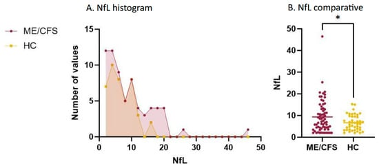 NfL levels per group. (A). NfL histogram. (B). NfL comparative. Note: NfL values are shown in pg/mL. * p < 0.050. HC: healthy controls; ME/CFS: myalgic encephalomyelitis/chronic fatigue syndrome; NfL: neurofilament light chain.