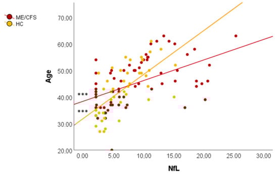 Linear regressions between NfL and age. *** p < 0.001. HC: healthy controls; ME/CFS: myalgic encephalomyelitis/chronic fatigue syndrome; NfL: neurofilament light chain.