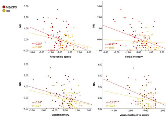 Plasma NfL correlations with cognition. * p < 0.05, ** p < 0.01, *** p ≤ 0.001. Note: values are shown in z-scores. ME/CFS: myalgic encephalomyelitis/chronic fatigue syndrome; NfL: neurofilament light chain.
