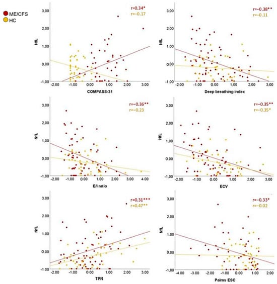 Plasma NfL correlations with ANS parameters. * p < 0.05, ** p < 0.01, *** p ≤ 0.001. Note: values are shown in z-scores. COMPASS-31: Composite Autonomic Symptom Score; ECV: extracellular cardiac volume; E/I ratio: expiration–inspiration ratio; ESC: electrochemical skin conductance; HC: healthy controls; ME/CFS: myalgic encephalomyelitis/chronic fatigue syndrome; NfL: neurofilament light chain; TPR: total peripheral resistance.