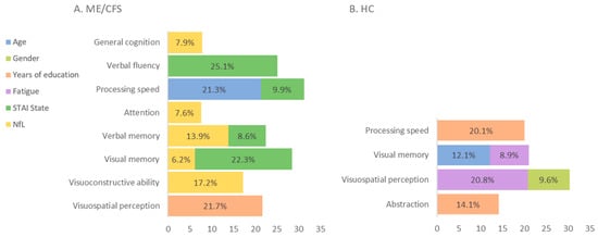 Linear regressions in cognition. (A). Stepwise linear regression in ME/CFS. (B). Stepwise linear regression in HC. HC: healthy controls; ME/CFS: myalgic encephalomyelitis/chronic fatigue syndrome; NfL: neurofilament light chain; STAI: State–Trait Anxiety Inventory.
