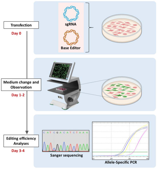 Base editing emerges as a highly effective strategy for creating new hiPSC models that only vary by one single base. However, it is important to note that there are often multiple combinations of base editor (BE) and guide RNA (sgRNA) that can be used for this purpose. As hiPSCs are both hard to transfect and to culture, we chose not to evaluate the editing feasibility with this cell type, as it would be time and money-consuming. We decided to use the convenient, economical, cultivable, and transfectable HEK-293T cells as a first step to test different CRISPR-Cas9 base editing strategies. HEK-293T cells appear to be the prime choice, as this cell line is economical, cultivable, and easy to transfect. We opted for two main experiments on the CRISPR-cell lysates: (1) Sanger sequencing to first roughly visually evaluate the editing, and (2) allele-specific PCR (AS-PCR) to assess the ratio of editing. AS-PCR was performed using two sets of primers to estimate both the ratio of wild-type and edited DNA in the cell pool. With this strategy, only four days are necessary to evaluate various combinations of sgRNA-BE and to determine which one was the safest choice in order to continue on hiPSCs (Figure 1).
