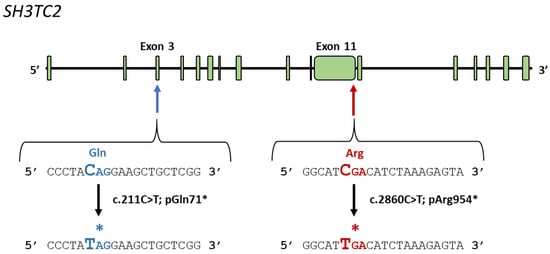 Schematic illustration of the relevant regions of the SH3TC2 locus. The area encompassing the positions of interest are pointed by a blue (c.211C>T; pGln71*) and a red arrow (c.2860C>T; pArg954*). The nucleotides depicted in the figure represent the specific targets for the sgRNAs used in CRISPR-mediated cell editing. The codons undergoing the variations are indicated in bold color, and a mutated couple of nucleotides are represented by bigger letters. The star indicates a stop codon.