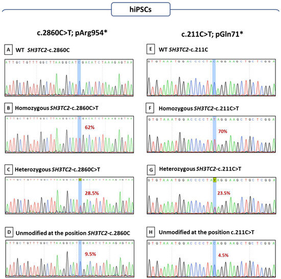 Sanger sequencing of the region of interest in hiPSCs: for the SH3TC2-c.211C>T-p.Gln71* alteration (A) wild-type hiPSCs (WT), (B) homozygous clone, (C) heterozygous clone, and (D) unmodified clone and for the SH3TC2-c.2860C>T-p.Arg954* alteration (E) wild-type hiPSCs (WT), (F) homozygous clone, (G) heterozygous clone and (H) unmodified clone. The cytosine of interest is highlighted in blue. The ratios of C>T edition at the position of interest are specified in bold red.