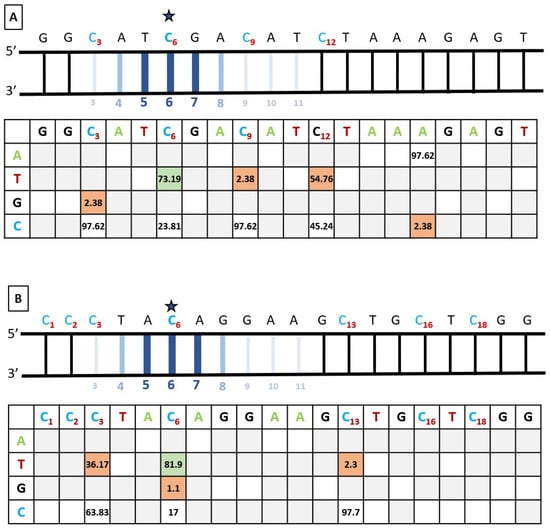 Bystander editing, often encountered when performing base editing, could pose significant challenges. For both alterations, the editing window was located between the 4th and the 8th nucleotide, and nucleotides 5 to 7 had the highest chance of editing. Still, three C at the 3rd, 9th, and 12th positions and six C at the 1st, 2nd, 3rd, 13th, 16th, and 18th positions were respectively comprised in the sgRNA2 and sgRNA3 (Figure 5A,B). They could potentially be subject to cytosine base editing, as the activity window does not follow a rigorous pattern.