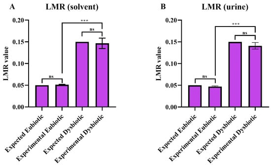 Comparison of LMR values calculated by fluorescence assay in dysbiotic and eubiotic samples. Fluorescent measurement in solvent (A) and urine (B) are then compared with their ab initio expected values. Values represent the average ± SD of three replicates. Statistical significance was calculated by Student’s t-test. p value *** < 0.0005; ns = non statistically significant.