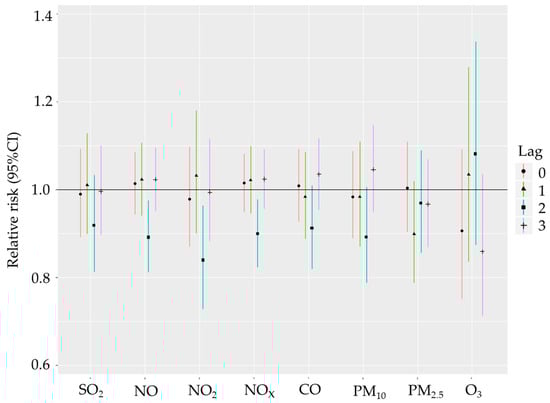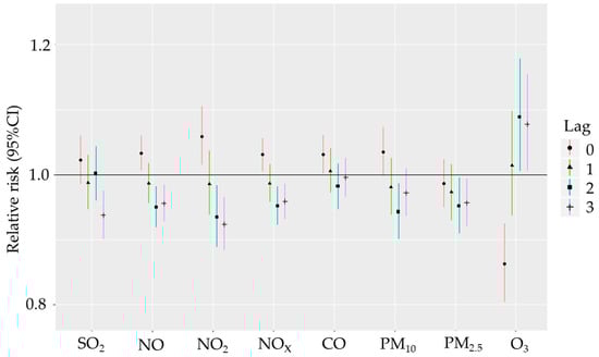 Relative risk with 95% CI of ICH incidence for IQR changes in air pollutant levels (SO2—sulphur dioxide, NO—nitrogen oxide, NO2—nitrogen dioxide, NOx—nitrogen oxides, CO—carbon monoxide, PM10—particulate matter with diameter < 10 µm, PM2.5—particulate matter with diameter < 2.5 µm, O3—ozone) for 0 to 3 days “exposure—disease onset” time delay in single-pollutant model in Gdansk from 1 January 2014 till 31 December 2018 (lag—exposure-outcome delay, e.g., lag1—observed effect is 1 day after exposure).