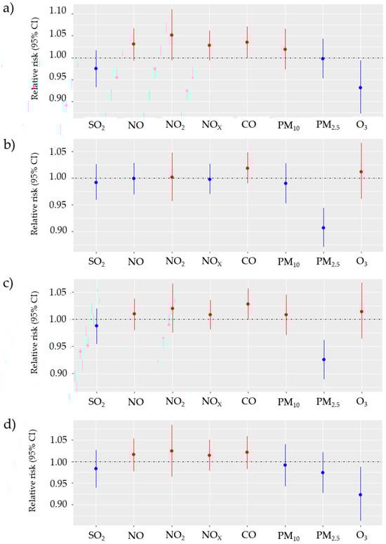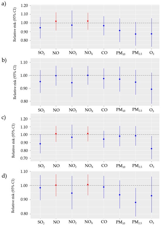 Relative risk with 95% CI of ICH incidence for IQR changes in air pollutant levels SO2—Sulphur dioxide, NO—nitrogen oxide, NO2—nitrogen dioxide, NOx—nitrogen oxides, CO—carbon monoxide, PM10—particulate matter with diameter < 10 µm, PM2.5—particulate matter with diameter < 2.5 µm, O3—ozone) in the single-pollutant model in Gdansk from 1 January 2014 till 31 December 2018 for (a) females, (b) males, (c) population at age 65 and older, (d) population younger than 65 years.
