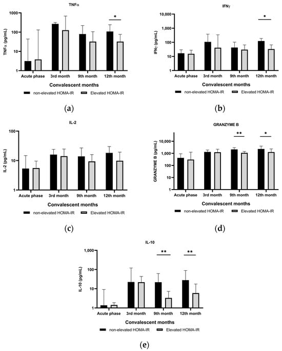 Secretion levels of (a) TNFα, (b) IFNγ, (c) IL-2, (d) granzyme B, and (e) IL-10 detected from the SARS-CoV-2-stimulated supernatant obtained from convalescent COVID-19 patients. Black bars represent COVID-19 convalescent patients with non-elevated HOMA-IR, and gray bars represent those with elevated HOMA-IR. Acute phase indicates that the samples were obtained during acute COVID-19 infection. * p value < 0.05 and ** p value < 0.01. TNF-α, tumor necrosis factor α; IFNγ, interferon γ; IL-2, interleukin-2; IL-10, interleukin-10. All cytokine levels are presented as median (interquartile range) and were compared using the Mann–Whitney test.