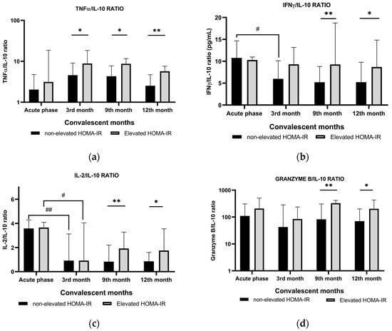 (a) TNFα/IL-10, (b) IFNγ/IL-10, (c) IL-2/IL-10, and (d) granzyme B/IL-10 ratios detected in the SARS-CoV-2-stimulated supernatant of the samples obtained from the convalescent COVID-19 patients. Black bars represent convalescent COVID-19 patients with non-elevated HOMA-IR, and gray bars represent those with elevated HOMA-IR. Acute phase indicates that the samples were obtained during acute COVID-19 infection. * p value < 0.05 and ** p value < 0.01. # p value < 0.05 and ## p value < 0.01 compared with the acute phase. TNF-α, tumor necrosis factor α; IFNγ, interferon γ; IL-2, interleukin-2; IL-10, interleukin-10. All cytokine levels are presented as median (interquartile range) and were compared using the Mann–Whitney test. Differences in IFNγ/IL-10 and L-2/IL-10 ratios between the acute phase and 3rd convalescent month were analyzed using the Wilcoxon signed-rank test.