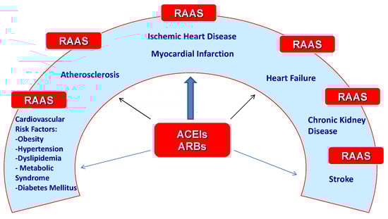 The renin–angiotensin–aldosterone system (RAAS) and its significant classical role in the occurrence of arterial hypertension was first discussed in the 1960s [2,3]. In 1976, the first converting enzyme inhibitor, captopril, was patented, and in the early 1980s it was recognized as a medication for lowering blood pressure values [4]. Afterwards, other converting enzyme inhibitors (ACEIs) were developed, and then the blockers of AT1 receptors of angiotensin II (ARBs) or sartans were discovered. Over time, the understanding of RAAS has expanded tremendously, with ACEIs and ARBs having an important role in the treatment of heart failure by blocking RAAS at different steps. Also, these drugs, especially ACEIs, have anti-atherosclerotic effects, too. RAAS is ubiquitous in multiple organ systems, especially the kidneys, systemic vasculature, and adrenal cortex, and is strongly involved in the pathogenesis of hypertension, heart failure, other cardiovascular diseases, and renal diseases. Due to its multiple valences, RAAS plays a crucial role in all stages of the cardiovascular continuum, starting with several cardiovascular risk factors, and continuing with the development and progression of atherosclerosis, ultimately leading to the onset of heart failure.
