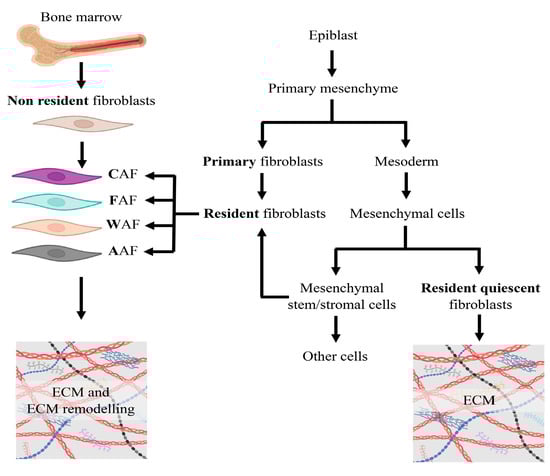 Indeed, fibroblast heterogeneity already starts during development through evolutionary conserved mechanisms. Fibroblasts, known as “primary fibroblasts”, derive from the mesenchyme following epithelial mesenchymal transition of epiblasts, giving rise to “resident fibroblasts”. The primary mesenchyme is the source of the mesoderm from which originate different mesenchymal cell types, including fibroblasts that populate postembryonic developmental tissues. These cells, also described as “resident quiescent fibroblasts”, are the major contributor of extracellular matrix homeostasis, migrate, and respond to stimuli, exhibiting features of pluripotency. A subset of mesoderm-derived cells, known as mesenchymal stem/stromal cells (MSCs), are present in peripheral niches of adult tissues where they exhibit high manipulability, especially in terms of regeneration potential, and provide an additional supply of resident fibroblasts [9] (Figure 2). Beyond “resident quiescent fibroblasts”, also “non-resident fibroblasts” have been described, which may derive from direct conversion from one somatic cell type into another (e.g., bone marrow-derived mesenchymal stem cells or cellular trans-differentiation) (Figure 2).