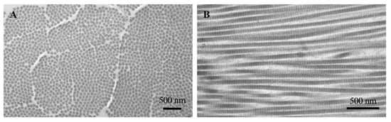 Transmission electron microscopy of collagen dermal fibrils cut transversely (A) and longitudinally (B). In longitudinal section, the fibrils show alternating light and dark bands. Images are from authors’ laboratory.