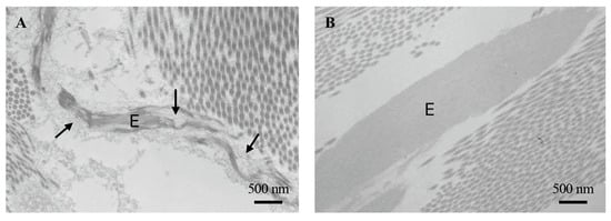 Transmission electron microscopy of elastic fibres in the skin of a healthy 5-day-old (A) and 50-year-old subject (B). The microfibrillar scaffold of elastic fibres is clearly evident in panel (A) (arrows). E: elastic fibres. Images are from authors’ laboratory.