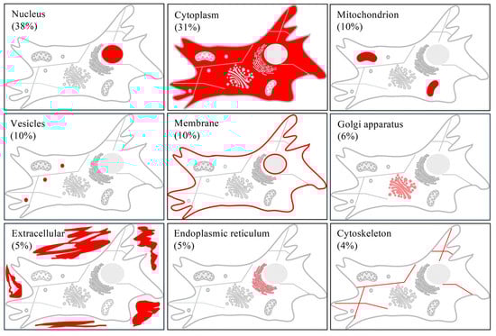 Proteomic analysis of cultured human dermal fibroblasts allows the identification of proteins belonging to different subcellular compartments. Some proteins are exclusively present in one compartment, whereas others are detected in different compartments.