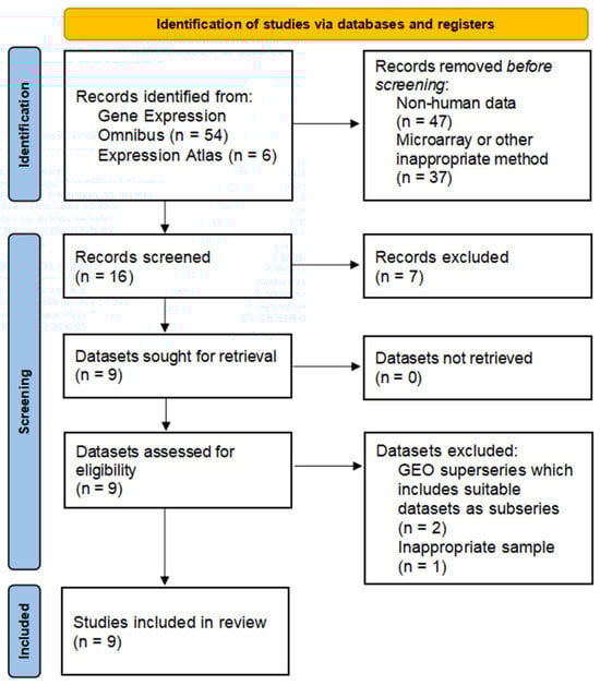 We reviewed all datasets, including data for gene expression in the duodenum. An initial search identified 60 records. The applied selection criteria reduced the number of datasets to six datasets from the GEO repository (Figure 1).