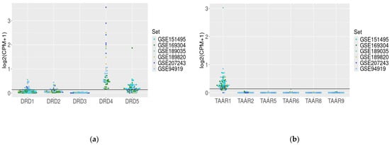 To estimate the dopamine and trace-amine-associated receptor expression in the healthy duodenal wall, we analyzed six transcriptome RNA-generated datasets. The extracted data demonstrated congruent DRD (except DRD3 mRNA) genes and TAAR1 gene expression in different datasets, representing the expression patterns in duodenal samples from healthy subjects (GSE151495, GSE169034, GSE189820, and GSE207243) and non-affected duodenal samples from patients with familial adenomatous polyposis (GSE94919, GSE189035, Figure 2a,b).