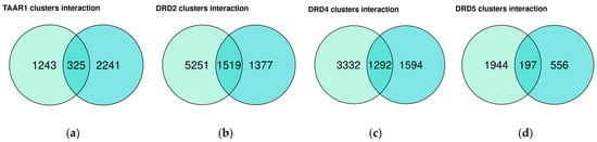 Two datasets included in the review, i.e., GSE151495 and GSE169304, comprise groups of duodenal samples from healthy subjects, which consist of more than 10 samples. For these datasets, we identified genes that are co-expressed with TAAR1, DRD2, DRD4, or DRD5 genes (ρ > 0, p < 0.05). The lengths and overlapping of the identified clusters are depicted in Figure 3a–d.