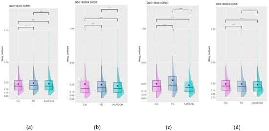 The GSE169304 dataset includes gene expression data for duodenal samples of healthy donors (n = 18) and patients with FD (n = 37). Age-matched FD and control groups were included in the study according to the design description in the paper, which describes the dataset. The mean age was 42 years for FD and 40 years for healthy subjects. Groups also were matched for body mass index (BMI); the mean values were 26.7 kg/m2 and 26.1 kg/m2 in the FD and control groups, respectively, and included 78% and 58% female subjects for the FD and control groups accordingly []. The expression of DRD2, DRD4, DRD5, and TAAR1 genes was detected in both study groups. No significant differences were identified in selected gene expression levels in healthy subjects’ mucosa and samples from FD patients.