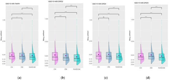 The impact of diabetic gastrointestinal complications on the duodenal mucosa was estimated in the GSE151495 dataset, which includes gene expression data for duodenal samples of healthy donors (n = 21) and patients with DM and associated gastrointestinal symptoms (DM, n = 39). The age, sex distribution, and BMI were not significantly different between groups, as specified by the dataset authors in the corresponding article. The mean age was 45 and 40 years for DM and healthy subjects, the mean BMI was 26 and 28 kg/m2, and 58% and 78% of subjects were female in the specified groups, respectively []. The expression of DRD2, DRD4, DRD5, and TAAR1 was not found to be significantly different between the mucosa of healthy individuals and samples from individuals with diabetes mellitus. Then, we estimated the functional similarity of genes most co-expressed (i.e., top 250) with TAAR1 and DRDs in healthy controls and patients with DM. Only a low number of common genes were identified in these groups (8 genes for TAAR1, 5 genes for DRD2, 48 genes for DRD4, and 15 genes for DRD5). For all four groups of co-expressed genes, the mean semantic similarity Wang values were higher than in the random gene set (n = 250, Figure 5a–d). Additionally, for DRD2 functionally connected with TAAR1, the mean semantic similarity values were slightly but significantly lower in the diabetes mellitus samples compared to healthy subjects’ mucosa. This loss of functional links may be related to the disruption of D2R- and TAAR1-mediated biologic processes in diabetic-associated islet damage (Figure 5a,b).