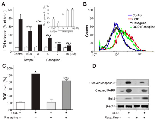 The ability of rasagiline to exert its neuroprotective effect was tested in a PC12 cell model exposed to OGD/R. Briefly, monolayer cultures of PC12 cells were exposed to 4 h of OGD followed by 18 h of reoxygenation in the presence of different micromolar concentrations of rasagiline [34] or 1500 μM tempol antioxidant, a concentration previously found most effective for neuroprotection [35] (Figure 1A). It is evident that the addition of 10 μM rasagiline significantly (p ≤ 0.01%) decreased necrotic cell death by 33% as measured by LDH release compared to control OGD/R-exposed but untreated cells. This cytoprotective effect indicates that 10 μM rasagiline conferred 80% neuroprotection, which was twofold higher compared to the effect of tempol (Figure 1A-insert).
